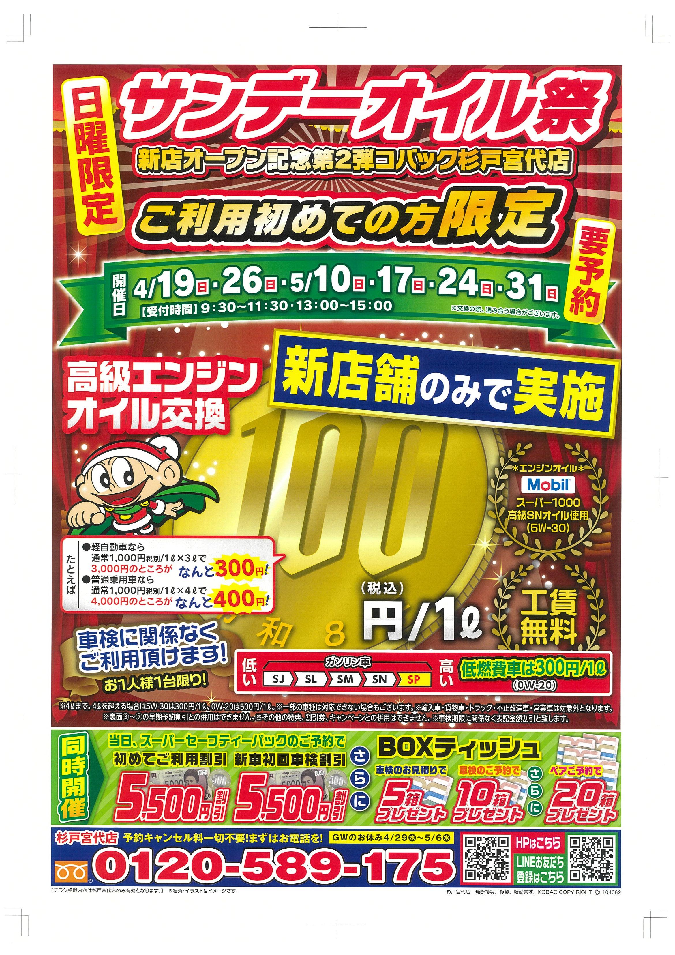 サンデーオイル祭の開催が決定致しました!!開催日は、4/19(日)・4/26日(日)・5/10日(日)・5/17日(日)・5/24日(日)・5/31日(日)